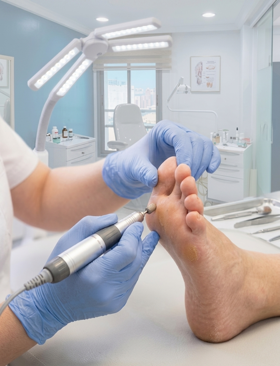 Décapage de peau morte, crevasses de talons, cors